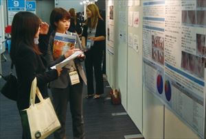 「ポスターセッション」とは、テーマとする臨床・研究結果をパネルポスターで展示発表するというもの。今年は展示パネルに29題目もの講演ポスターが掲出され、セッションの説明時間になると、担当者がそれぞれの研究成果を説明。それをしっかり聞こおうと参加者が一斉に集まります。